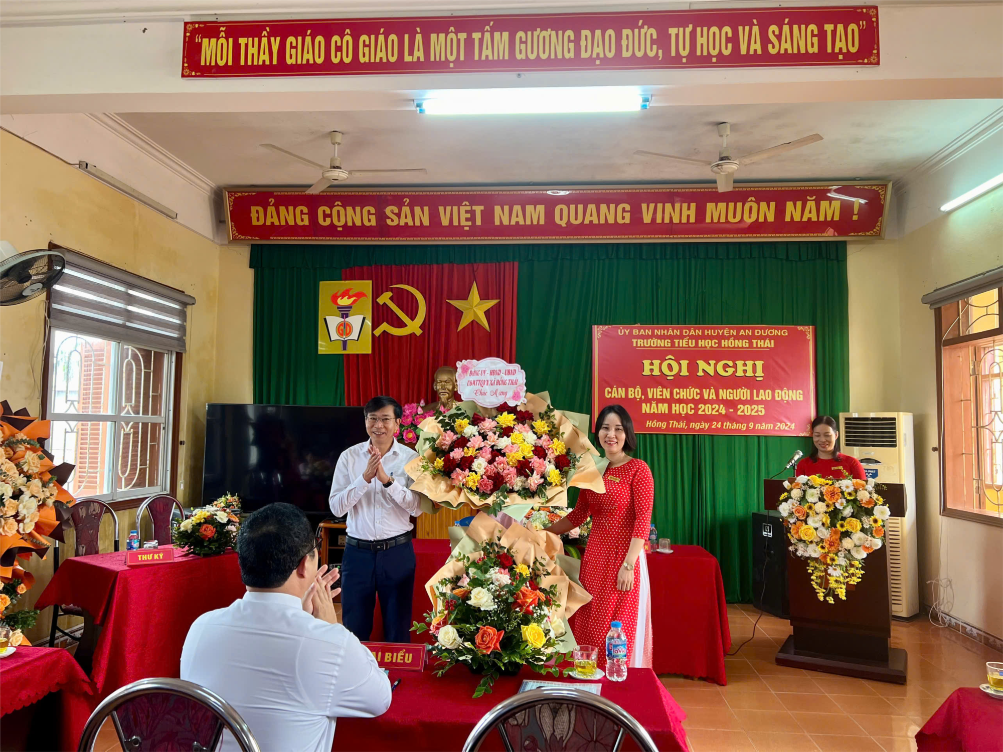 Thực hiện Công văn liên tịch số 1154/HDLT-SGDĐT-CĐN ngày 19/09/2024 của Sở Giáo dục và Đào tạo – Công đoàn ngành giáo dục về việc Hướng dẫn tổ chức Hội nghị cán bộ, viên chức, người lao động trong các cơ quan đơn vị công lập; Công văn số 287/PGDĐT ngày 06/09/2024 của Phòng GD&ĐT huyện An Dương về việc tổ chức Hội nghị cán bộ, viên chức và người lao động năm học 2024-2025. Sáng ngày 24/09/2024 trường Tiểu học Hồng Thái tổ chức Hội nghị cán bộ, viên chức và người lao động năm học 2024 - 2025, nhằm đánh giá việc thực hiện Nghị quyết của Hội nghị cán bộ viên chức và người lao động đã đề ra trong năm học 2023 - 2024, xây dựng chỉ tiêu phấn đấu và bàn biện pháp thực hiện kế hoạch, nhiệm vụ năm học 2024 - 2025.
