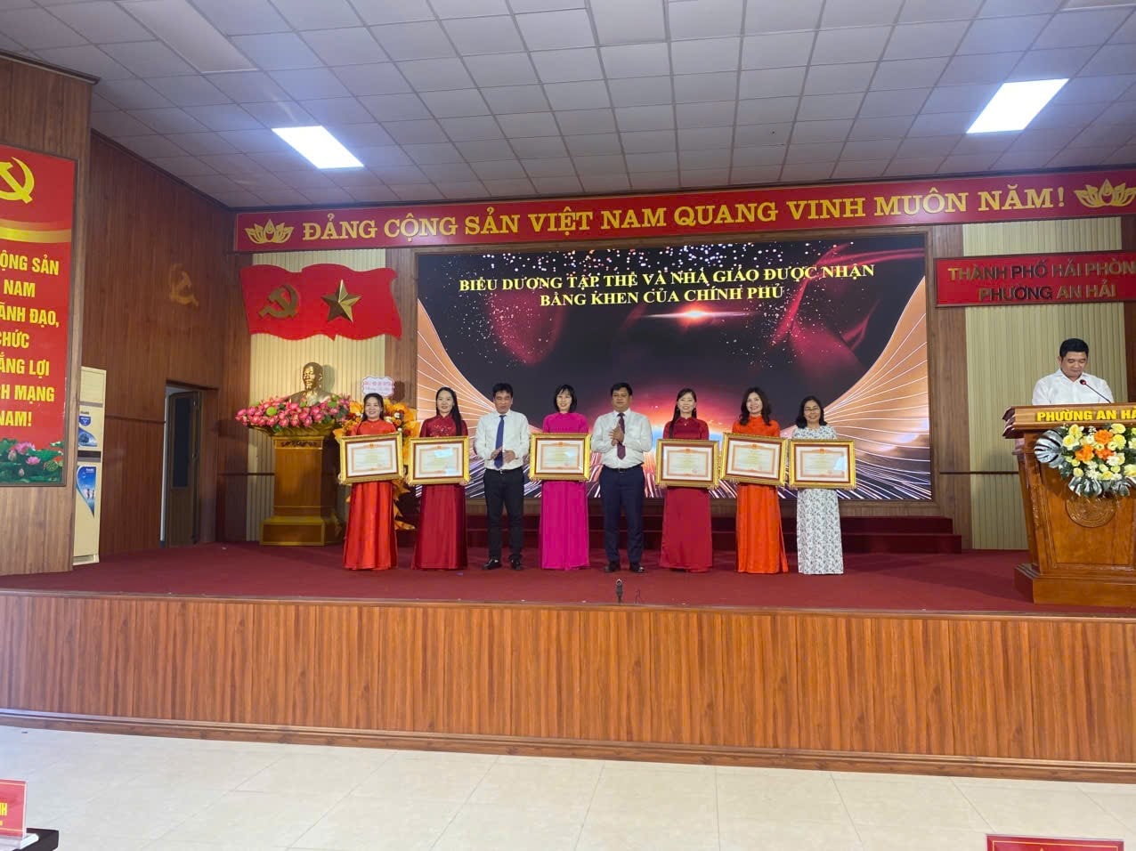 Các cô giáo: Đỗ Thị Phương Liên, Dương Thị Mây, Trần Thị Hải Yến, Đào Thị Huyền nhận giấy khen của Chủ tịch UBND phường vì đã có thành tích xuất sắc trong đổi mới phương pháp dạy học và ứng dụng công nghệ số năm học 2024-2025. (Vị trí thứ 1,2,3,4 phía bên trái)